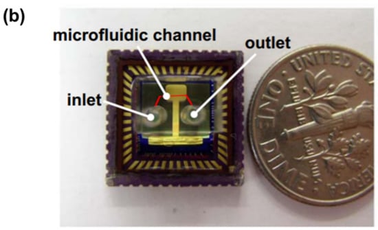 In addition, an optofluidic device for performing colorimetric measurement is presented in Figure 2a [36]. It allows a colorimetric reaction using a very small volume of sample and reagent (i.e., 20 µL), which are mixed in the T-mixer and connected by a serpentine channel where the interaction solution is provided to the emitter and photodetector for absorbance testing. Three inlets were designed on both sides of the T-mixer. The standard phosphate solutions and the water sample for calibration were introduced from one side. The reagent and two channels are for cleaning with deionized water (DI water) on the other side. In the microchannel, ammonium molybdate, (NH4)6Mo7O24·H2O, is reacted with ammonium metavanadate, NH4VO3, under acidic conditions. After being fully mixed and reacted, the vanadomolybdophosphoric acid complex, (NH4)3PO4NH4VO3·16MoO3, was generated in the resulting solution, which presented a distinct yellow color, and therefore was accompanied by the strong absorbance below 400 nm. Also, the long-term reliability of the device was demonstrated in this work. From the experimental results, it has been proven to have a limit of detection (LOD) of 0.2 mg/L and a dynamic linear range of 0–50 mg/L. Due to the limited storage capacity, the optofluidic device could allow for >11,000 measurements.