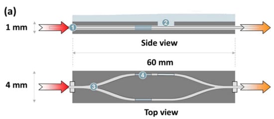 The method of luminescent bacteria testing is mainly to suppress the photoexcitation of Vibrio fischeri cells in response to the toxic effects caused by heavy metal ions. Vibrio fischeri luminesces by generating luciferase, which catalyzes the oxidation of long-chain fatty aldehydes and reduces flavin mononucleotides, with free energy being released with luminescent of excited wavelength 490 nm. The traditional inhibition test is usually done by adding a volume of a luminescent bacterial suspension to the cuvette. The criterion for the test judgment was the attenuation of luminous intensity measured after 15 min and 30 min. In an optofluidic system, by processing in parallel the samples and standard liquid and measuring the luminescent intensity changes, the inhibition rate could be determined conveniently and rapidly. In Zhao’s work [39], a novel optofluidic system based on the above principles and one-off toxicity assessments in ISO11384 was designed and characterized, as shown in Figure 3. The system worked via the following steps. First, the sample and luminescent bacterial suspension were continuously pumped into the micromixer at the same flow rate. After that, the mixture passed through a spiral microchannel to the viewing chamber. The optical measurement usually takes 20–30 min. Under fair control conditions of the Lab-on-a-Chip (LOC) system, the inhibition rate based on the luminescent intensity in the parallel microchamber could be calculated by observing and comparing the two steady states.