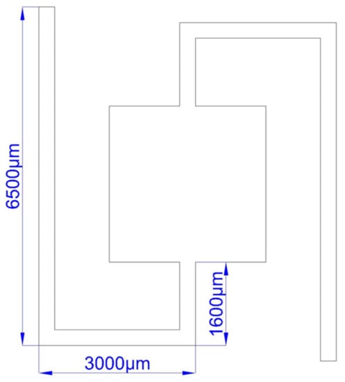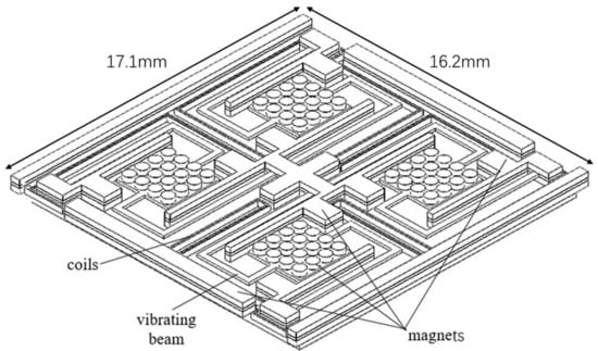 Because both ends of the beams are fixed while the trays are impending, when forced by external vibration, the trays, and the magnets on the trays, will vibrate. The magnetic flux in the coils changes with the vibration of the permanent magnets on the trays, which results in an induced current in the coils. The area of the harvester is 17.1 mm × 16.2 mm. The total lengths of the single beams are adjusted to 10,500 μm, 10,800 μm, 10,820 μm, and 11,100 μm, respectively, as shown in Figure 2, and the width of the beams is 300 μm. At this point, their resonant frequency can be simulated as 65.5 Hz, 67 Hz, 68.5 Hz, and 70 Hz. With other parameters unchanged, the longer the length of the beam, the lower the resonant frequency.