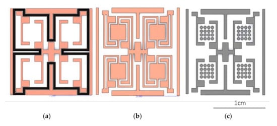 Three masks were used during the fabrication process, as shown Figure 3. The black, orange, and gray parts in Figure 3 indicate the position of the coils, plated copper, and magnets, respectively. The general choice for plating permanent magnets is CoNiMnP. Sun et al. [] studied the CoNiMnP permanent magnet plating process, using a thick magnet array to replace a magnet film and achieving higher performance. In addition, they gave the ratio of the electrolytes in the electroplating process. As for the shape of the magnets, cylinder arrays magnets show better retentivity and energy density than cubic arrays. For cylinder arrays, the retentivity and energy density increase as the radius decreases.