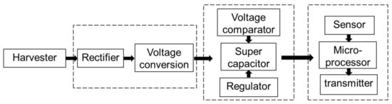 The vibration energy collected by the harvester is converted to electric power, but the power cannot be stored directly by a capacitor or battery. A subsequent circuit is needed to do an AC/DC conversion, charge the super capacitor and battery, and control the capacitor to output a stable voltage for the other chips in a WSN node. The circuit includes a rectifier, a voltage conversion module, a super capacitor, a voltage comparator, and a regulator, as shown in Figure 4. Similar circuits have been used for solar, thermal [], and triboelectric energy [].