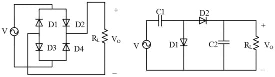 The general rectifiers are a full bridge circuit and boost rectifier. When input is the same (100 mV), the latter can output a higher but fluctuating signal, as shown in Figure 5. In simulation, when the input voltage is low, the second circuit can output a higher voltage than the full bridge circuit because the capacitor can store electricity power. The diodes and capacitances used in the simulation are 1BH62 and 10 μF, respectively.
