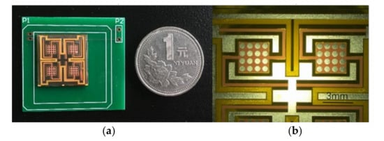In order to remove the photoresist expediently, KMPR negative photoresist (MicroChem, Westborough, MA, USA) was chosen for the lithography process. The production results and details are shown in Figure 6. The fabrication process and the results of the harvester basically meet the abovementioned design requirements and any errors of dimensional accuracy are within the acceptable range.