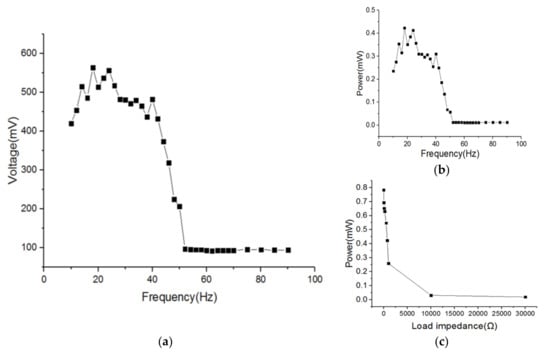 As shown in Figure 7, when the acceleration is of 1g and the load resister is 750 Ω, the test results of the harvester show that the harvester chip can output discontinuous pulse voltage, and the range of the voltage value is from tens to hundreds of millivolts in the vibration frequency range of 10–90 Hz. The maximum value that can be reached is 563 mV (at the vibration frequency of 18 Hz) and power is 0.423 mW. The harvester shows better performance in the low frequency range (10–40 Hz), the output voltage is above 200 mV, and power is above 0.2 mW. The internal resistance of the harvester is very small (about 1 Ω) compared with the load. When the load resistance is close to the internal resistance of the harvester, the output power is high, and the maximum power reaches 0.784 mW as the load is 1 Ω, and as the external load gradually increases, the output power becomes lower. When the load is larger than 10,000 Ω, the output power is lower than 0.1 mW.