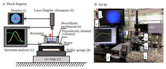 A line-free mass sensor consists of a disk-shaped mechanical resonator (disk-shaped resonator), a separate piezoelectric element (20 mm diameter and 0.5 mm thickness, NEC Tokin Corporation, Miyagi, Japan) used to excite vibrations in the resonator (vibrator), and a fabricated microfluidic mechanism (Figure 1A,B). For use as a mass sensor, the line-free mass sensor is placed on an xyz-stage (TSD-805S, Sigmakoki Co., Ltd., Tokyo, Japan) across a buffer sponge (thickness of 10 mm). A heater is used to maintain the temperature of the fluid (MPHK 50*50, Misumi Group Inc., Tokyo Japan). A spectrum analyzer is used as an alternating current power source (R3755A, Advantest Corporation, Tokyo, Japan). Since the power source is used to actuate the vibrator, the sensing element (i.e., the disk-shaped resonator) is free from power lines. A laser Doppler vibrometer microscope (KV-100, Denshigiken Corporation, Kanagawa, Japan) and a spectrum analyzer (1 mHz frequency resolution) were used for measuring the resonance frequency of the disk-shaped resonator.