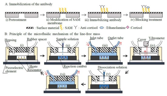 Building on near-patient monitoring, numerous biosensors have been introduced for the diagnosis of diseases and for health monitoring [1]. The growing demand for compact biosensor devices for analyzing human samples such as proteins, mRNA, and DNA on the micro- or nano-liter scale eventually led to the development of the lab-on-a-chip concept and micro total analysis systems [2,3]. Point-of-care testing (POCT) is particularly valued for the portability, immediate availability of test results, and multiple monitoring capabilities that it provides [4]. Additionally, supplying a saliva sample evokes less anxiety for patients than providing a blood sample, and less embarrassment than producing a urine specimen. Unlike the phlebotomy skills required for blood collection, saliva samples are easily procured. Multiple sampling over a day or over many days can be readily completed in the field or at home, thus increasing the feasibility of longitudinal studies [5]. Thus, noninvasive measurement techniques using saliva are suitable for POCT. The intersection of the growing body of knowledge about mental health bioindicators with advances in proteomic technologies represents great potential for the early detection, diagnosis, and management of a range of stress-related disorders. Of particular interest is the stress hormone cortisol, which reflects the underlying neuroendocrine response to stressors and is commonly used as marker of stress reactivity [6,7]. However, it is necessary to increase the sensitivity by about 10 times for analyzing salivary biomarkers compared with blood analysis [8]. The proportion of salivary cortisol to total cortisol is about 1–2% in the lower range, but about 8–9% in the upper range.