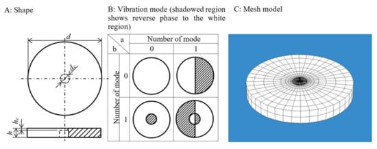 A disk-shaped resonator with a thin plate portion at its center was proposed (Figure 3A). The center of the disk-shaped resonator was designed to vibrate as a peripheral fixed boundary condition in 0–1 mode (Figure 3B). Since the amplitude of the ultrasonic vibration was quite small, the resonator did not slip down from the piezoelectric element. This sensor used a standing wave, so the resonator would not move. In the theoretical equation of a disk-shaped resonator, the resonance frequency is proportional to the thickness of the center (hc) and inversely proportional to the square of the center diameter (dc) [28]. The outer-diameter (d), center-diameter (dc), thickness (h), and thickness of center (hc) of the disk-shaped resonator were determined by calculation using an eigenvalue–eigenvector evaluation employing a finite element method (COMSOL Multiphysics Ver. 5.20, COMSOL AB, Stockholm, Sweden) [29]. The total numbers of elements and nodes were 12,000 and 63,700, respectively (Figure 3C). The boundary conditions at the outer peripheral edge of the disk-shaped resonator were set to the free-free edge type. Si was selected as the material for the disk-shaped resonator, and the density, longitudinal modulus of elasticity, and Poisson’s ratio were set to be 2329 kg/m3, 185 GPa, and 0.28, respectively. Air (1.29 kg/m3 of density) and water (999.97 kg/m3 of density) were used as the media.