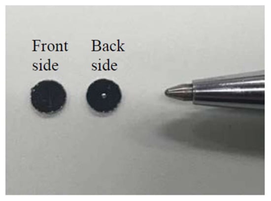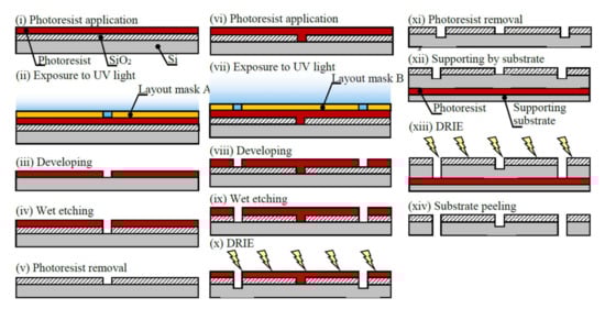 Figure 4 shows the manufacturing process of the disk-shaped resonator using photolithography with deep-etching. The wafer was coated with a positive-type photoresist (OFPR-800, Tokyo Ohka Kogyo Co., Ltd., Kanagawa, Japan) using a spin coater (ASC-4000, Actes Inc., Atsugi, Japan). The photoresist was exposed to a pattern for 8 s at an intensity of 48.0 mW/cm2 using layout mask A and a mask aligner (MA6, Suss MicroTec KK, Kanagawa, Japan). The silicon was wet (liquid)-etched to remove the unprotected oxide. The photoresist was removed from the substrate using a resist stripper.