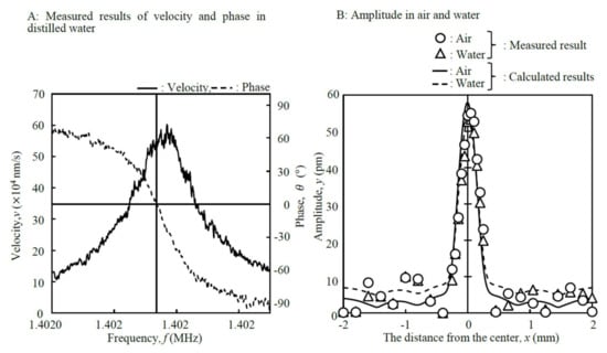 Figure 5 shows the fabricated disk-shaped resonator imaged by photolithography. The dimensions were d = 4 mm, dc = 0.5 mm, h = 0.5 mm, and hc = 0.1 mm, respectively. Table 1 shows the calculated and measured results for the resonance frequencies of the disk-shaped resonator for each medium. The measurements were performed at room temperature (25 °C). In order to obtain high sensitivity, the dimensions of the disk-shaped resonator were selected so that the resonance frequency would be 4 MHz in the air. The calculated result was 3.862 MHz, which agreed well with the measured result of 3.841 MHz. The resonance frequency of the disk-shaped resonator decreased to 1.402 MHz when it was dipped in distilled water. The Q-factor calculated from the measured result of the velocity in distilled water was 7748 (Figure 6A). The Q-factor was comparatively high compared with those given in previous reports of between 3390 and 6800 [30,31]. The measured amplitude of the disk-shaped resonator agreed well with the calculated value in both media (Figure 6B). Based on the results, the vibrating area was estimated to be 0.20 mm2.
