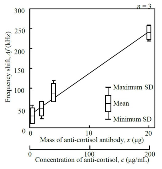 I. Mass of anti-cortisol antibody (x): Figure 7 shows the relationship between the frequency shift, Δf, and the mass of the anti-cortisol antibody, x, measured at 1.402 MHz in a range between 0.4 µg and 20 µg. The frequency shift increased proportional to the mass of anti-cortisol antibody immobilized on the surface of the disk-shaped resonator, and Δf reached its maximum of 240.0 ± 16.4 Hz. From a cost perspective, 20 µg was selected.