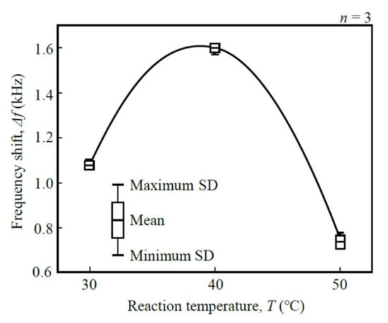 II. Temperature of reaction chamber (T): The influence of the temperature of the reaction chamber, T, on the frequency shift, Δf, was evaluated under conditions around human body temperature (Figure 8). The frequency shift reached its maximum of 1599.3 ± 21.3 Hz when the temperature of the reaction chamber was 40 °C. It was concluded that 40 °C should be used for the immunoreaction of the anti-cortisol antibody.