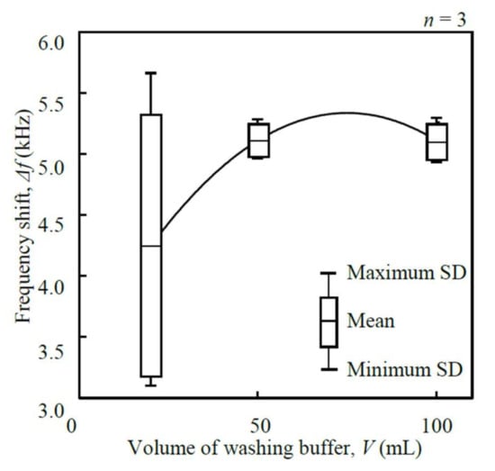 III. Volume of washing buffer (V): The volume of washing buffer, V, was optimized in order to maximize the frequency shift, Δf (Figure 9). The flow rate was set to be constant at 10 mL/min, because too high a flow rate would cause peel-off of the antibody. The washing procedure was considered necessary because the SD at 20 mL was very large. The frequency shift became saturated as the volume of washing buffer was increased. The frequency shift reached a maximum of 5110.0 ± 132.4 Hz when the volume of washing buffer was 50 mL. Thus, it was concluded that 10 mL/min × 5 min was enough to remove impurities from the reaction chamber of the microfluidic mechanism.