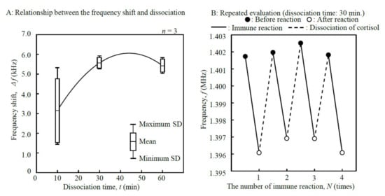 IV. Dissociation time (t): If the dissociation time, t, is insufficient, the frequency shift will decrease. The dissociation time was optimized not only to maximize the frequency shift, Δf, but also to enable reuse of the immobilized anti-cortisol antibody for sensing (Figure 10A). The frequency shift reached its maximum of 5564.0 ± 276.0 Hz when the dissociation time was 30 min. Figure 10B shows the repeated evaluation when both immunoreaction and dissociation were performed using one disk-shaped resonator with 30 min of dissociation time. The CV of Δf in the immunoreaction was 4.96% when the measurements were repeated N = 4 times. One report describes more than 100 cycles of repeated measurements with a label-free technique, the binding was 96% of the initial binding [32]. Similar numbers of repeated measurements might be possible to be a motif with other label-free techniques.