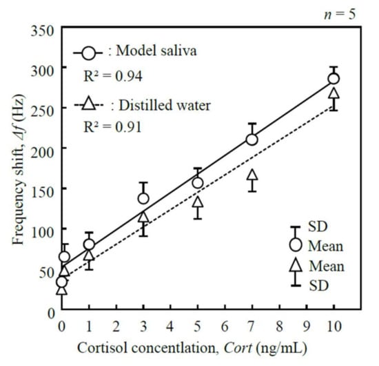 Calibration curves of standard cortisol samples in distilled water and model saliva as solvents (1.402 MHz measured frequency, 200 μL sample solution).