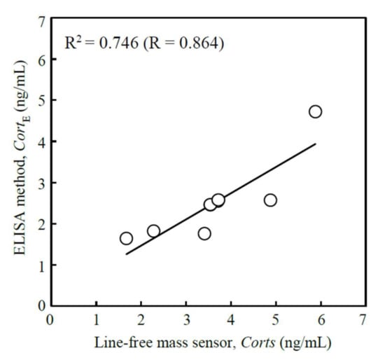 The relationships between the conventional assay, the enzyme-linked immunosorbent assay (ELISA) method, CortE, and the fabricated line-free mass sensor, CortS, in the use of human saliva samples are shown graphically in Figure 12. The relationship was given by CortE = 0.6361 CortS + 0.1976 (ng/mL). The correlation coefficient, R2, was 0.746. The sensitivity of the line-free mass sensor was enough to analyze the human salivary cortisol when a 200 µL of sample saliva was used.