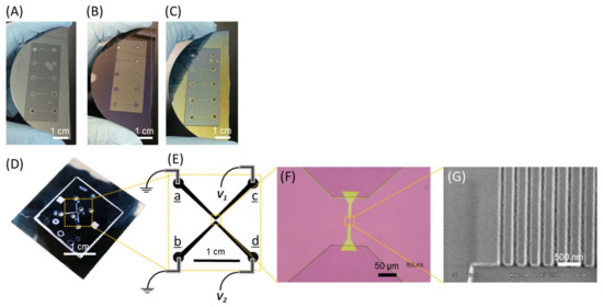 Microfluidic devices for dielectric breakdown experiments (A–C) and a nanofluidic device for single DNA molecule observation (D–G). (A–C) Image of microfluidic devices with (A) natural oxide (NO) layer, (B) 100 nm thick, and (C) 250 nm thick silicon dioxide layer on the surface of silicon substrate formed via CVD. The dimension of all the microchannels were; 200 μm in width, 2 μm in depth, and 1 cm in length. (D) Image of the nanofluidic devices. Micro- and nanochannels were fabricated on a silicon substrate and covered with glass via anodic bonding. (E) Schematic illustration of the micro- and nanochannels and the electrodes setup. (F) Optical microscope image of the nanochannels bridging two wide microchannels. The highlighted region by yellow indicates the area fabricated by EB lithography. (G) Scanning electron microscope image of the nanochannels. Both the width and the depth of the nanochannels are 100 nm and the length is 10 μm.