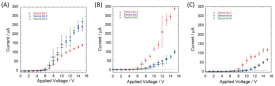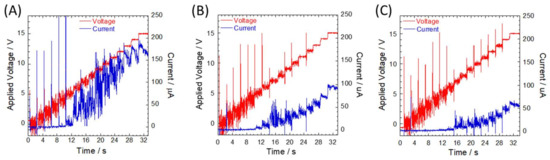 Although the plots in Figure 3 present typical results of single-step increments over the critical applied voltage, more than two-step increments of the currents were observed in some cases (Figures S3–S6). This could be attributed to manner of defect formation in the silicon dioxide layer or the distance between defects, which established electrical conduction. Given that insulation defects were randomly formed when voltage was applied to the microchannel between the reservoirs, multiple electrical paths were formed at different locations at varying time points on the silicon substrate beyond silicon dioxide layer. This phenomenon could have been responsible for the observed multiple-step increments of the current–voltage (I–V) curves.
