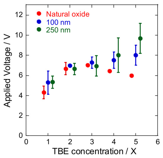 Average voltage applied at the time of dielectric breakdown under different oxide layer thicknesses and buffer concentrations (n = 3). At the same concentration of TBE buffer, three plots and error bars depicted in red, blue, and green were intentionally shifted, so as to be easily seen.