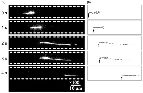 (A) Electrophoretic migration behavior of a single T4 DNA molecule in a 100 nm wide and 100 nm deep nanochannel, which is arrayed continuously side-by-side with 400 nm spacing inside dashed white lines. An electric field of around a few V/cm was applied horizontally along the nanochannels. (B) Presumed DNA conformation is depicted as a black line in the right for clarity. The folded and twisted parts, indicated by arrows, could be caused by defects in the silicon dioxide layer during anodic bonding. The DNA molecule appears to switch the nanochannel vertically during migration.