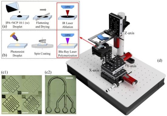 Diagrams of the laser ablation (a) and DLW (b) microfabrication methods to fabricate microstructures directly in transparent plastics such as PMMA, PDMS, PLA, and Loctite 3525 (c1) or by direct laser writing in Loctite 3525 (c2). Everything was achieved with the benchtop laser platform with two laser wavelengths (d). Electronics are not shown for clarity. Scale bars are 1 mm.