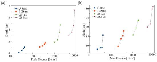 Lasing conditions like pulse or dwell time, power density, and number of passes are important to set when characterizing the ablation of a polymeric material using our method and setup. Figure 2 presents typical resolution characterization results obtained for PMMA using profilometry (AlphaStep® D-600 Stylus Profiler, KLA-Tencor, Milpitas, CA, USA). An array of parallel lines was etched in an acrylic sheet at different laser intensities and pulse durations in order to monitor their influence on ablated patterns. As expected in laser ablation, it is clear that laser pulse time and power density are critical to control width (Figure 2a) and depth (Figure 2b) of the etched features for PMMA and this behavior was observed for all four tested materials here, although final features dimensions are different for each. This procedure is recommended to test our ablation method for each new material and repeatability and reproducibility may also be addressed in this manner.