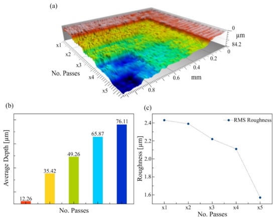 Example of a 3D profile obtained by ablation with multiple laser passes: (a) 3D profile of the successive etched layers; (b) the average depth of a square region etched one to five times (1X to 5X); and (c) the Root Mean Square roughness of the etched area as a function of the number of passes.