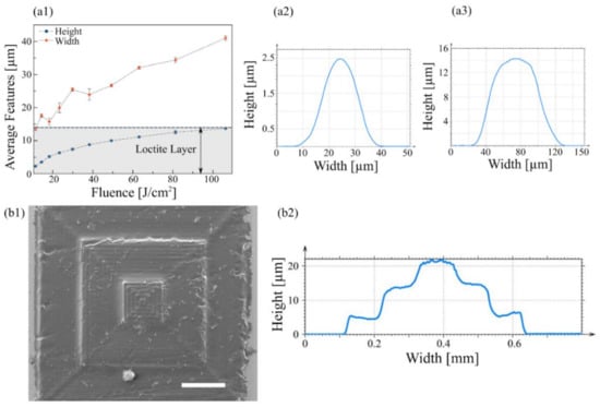 (a1) Dimensions of crosslinked features on Loctite 3525, and profiles of the (a2) smallest and (a3) tallest features fabricated with 4 W/cm2 and 106 W/cm2 respectively. (b1) SEM micrograph of a 3D pyramid fabricated on a single layer of Loctite 3525 by crosslinking the material in a Z-stepper fashion with a laser power density of 37.05 W/cm2; and (b2) the profile measured at the middle of the pyramid.