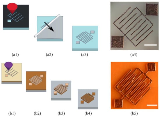 Microelectrodes fabrication processes: local laser ablation of PMMA etches interdigitated microchannels that are filled with carbon paste using doctor blading (a1–a4) and DLW is used on a thin Loctite layer as a protective coating to chemically etch a PCB copper board (b1–b5) Scale bars are 500 µm and 1 mm for (a4) and (b5) respectively.