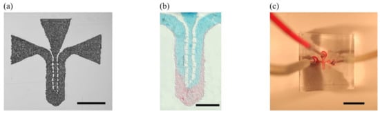(a) Laser micropatterned PMMA mold for two-input two-output microfluidic channel design. (b) Example of colorant diffusion microfluidics inside PDMS microchannel for bonding validation. (c) Microfluidic device (Scale bars: (a) 1 mm, (b) 500 µm, (c) 5 mm).