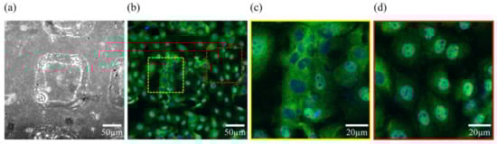 (a) Bright field photograph of a squared microwell. (b) Regionalized hepatic C9 cells cultured onto PDMS replica, (yellow discontinued square corresponds to (c) and the red one corresponds to (d)). (c) In response to spatial confinement, cells upon/atop the microwell present YAP/TAZ (green) in the cytoplasm as shown by the non-colocalization with the nuclei stained with DAPI (blue). (d) On the contrary, cells outside the microwell, have YAP/TAZ in the nuclei, as shown by the colocalization with DAPI (full experiment unpublished at the time).