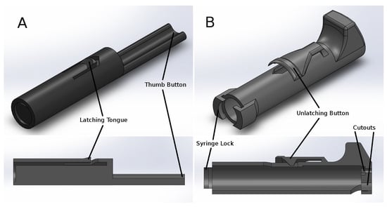 CAD renderings of printable parts and cross-sections. (A) The printed plunger part is a shaft that pushes on the syringe plunger and slides in the printed body part. The printed plunger has a latching tongue and button, which interfaces with the printed body part. (B) The printed body part holds the syringe and interfaces with the printed plunger part. The body part features the unlatching button and slots to hold the syringe in place by its flanges. The body part also has two cutouts in the top for the plunger button and for the hex nut and bolt. STL files of the printable parts are available in the Supplementary Materials.