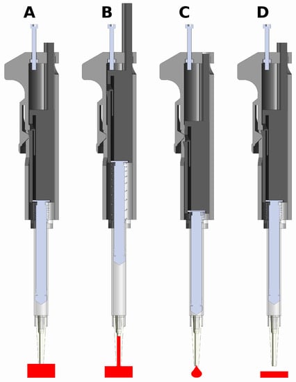 CAD renderings of assembled pipette and function. The pipette actuates the syringe to three positions. (A) The latched position. When the plunger is pressed, the pipette locks at this position. The tip is then placed in a liquid, and the unlatching button is pressed to release the pipette back to the set position (B), drawing in liquid. (B) The set position. The position of the screw determines the total displacement that the plunger moves. The pipette is spring loaded to return to this position. (C) The blow-out position. The fluid is transferred by pressing the plunger past the latched position to blow-out all the liquid. (D) Return to the latched position. The pipette returns to the latched position ready to perform another transfer.