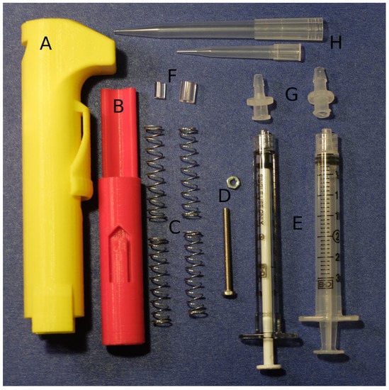 Photo of the parts to make the pipette. (A) Printed body part. (B) Printed plunger part. (C) Springs. (D) M3 hex nut and M3 bolt. (E) Disposable syringes. (F) Two sizes of tubing to adapt pipette tips to luer barbs. (G) Luer lock syringe-to-barb adapters. (H) Pipette tips. A list of parts is in Appendix A: Table A1 and Table A2.