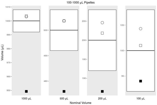 Comparison of the accuracy, or systematic error, among 100–1000-L pipettes. The box plot indicates the range of the ISO standard; the plotted circle indicates the commercial pipette; and the plotted squares are the printed pipette. Empty squares are with the printed pipette with our adjusted graduation scale, and the filled squares are measurements taken with the syringe’s existing graduations (data from Table 1.)