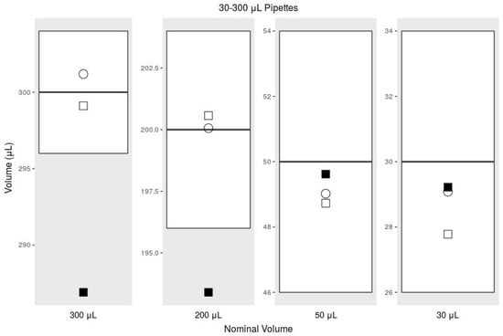 Comparison of the accuracy, or systematic error, among 30–300-L pipettes. The box plot indicates the range of the ISO standard; the plotted circle indicates the commercial pipette; and the plotted squares are the printed pipette. Empty squares are with the printed pipette with our adjusted graduation scale, and the filled squares are measurements taken with the syringe’s existing graduations (data from Table 2.)