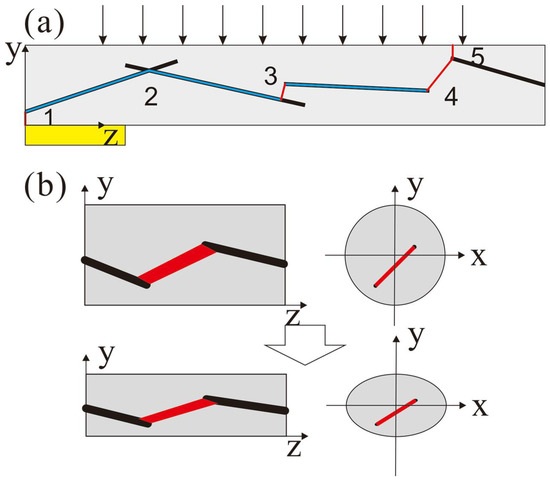 The electrical conductivity of sensitive fiber is mainly decided by the distance between the conduct fillers (the conductivity of MWNTs is 104 S/m, whereas that of PU is usually less than 10−12 S/m). However, different from the stretching situation, SMFs in the proposed sensor are compressed in the radial direction as shown in Figure 1a. This drawing also demonstrates a typical dispersion of MWNTs (simplified as long rods) in a PU fiber with an electric passage lined out. The blue lines are the passages along the surface of MWNTs, and red ones are the passages in the polymer that dominate the resistance of the composite fiber. The later passages could be divided into two kinds: the one connects to the outside of the fiber (as 1 and 5 in Figure 1a) and the other connects to the inside of the fiber (as 2, 3 and 4 in Figure 1a). Situation 2 shows that two MWNTs are contacted or within the tunneling distance, while situation 3 shows that two MWNTs are overlapped and four are the separated in the longitudinal direction. Considering the longitudinal distance between MWNT and electrode or between MWNTs in different fibers, situations 1 and 5 could be classified into situation 3 or 4. Thus, the resistance of one fiber could be described as