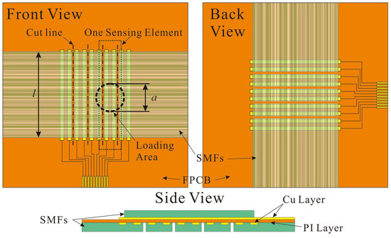 There are two layers of aligned composite SMFs in the proposed flexible tactile sensors. These layers are mutually perpendicular and fabricated on different sides of an FPCB (Figure 2). A serial of parallelized Cu strips on the polyimide (PI) film serve as electrodes which segment the sensing layer. PI and Cu layers are 20 μm and 15 μm thick respectively. The Cu strip is 0.25 mm width and the central distance of electrodes (CDoE) is set at 0.5 mm, 1.0 mm, and 2.0 mm to prepare sensors with different spatial resolutions. The detail of the fiber structure will be discussed in Section 3.1. It is very important that, between Cu strips, parallel resistor nets are formed to lower the resistance and increase the measurability of composite fiber. As in Figure 2, several cuts are made on the SMFs layer every two electrodes to separate each SE so as to decrease the coupling effect between adjacent ones. Considering an SE affected by a uniform stress, the impedance measured is