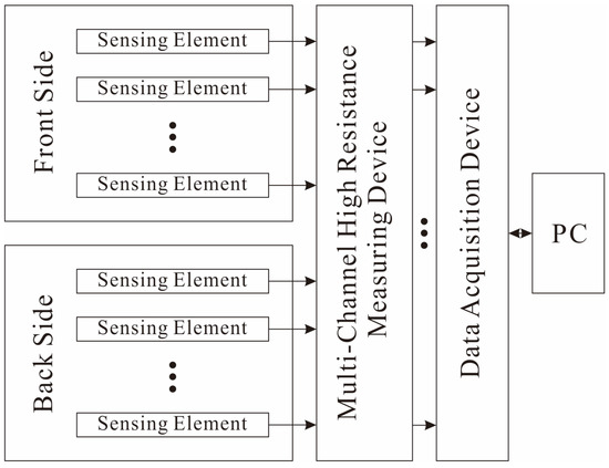 Figure 3 is the diagram of the data acquisition system. However, the normal multiplex circuits cannot obtain the current signal from the SE because of the high resistance. Thus, the resistance signals of piezoresistive arrays are converted to voltage signals by a specially developed 16-channel high resistance measuring device. Then, the signals are sent to the acquisition board (NI-6394, National Instruments Corporation, Austin, TX, USA) and the data are analyzed and displayed on a computer. By changing the mass ratio of fillers in composite, the average impedance between two electrodes could be adjusted to the scale of 109 Ω (see Section 3.1). Thus, the high resistance measuring device is designed to detect resistance variation ranging from 1.0 × 108 Ω to 0.4 × 1010 Ω.