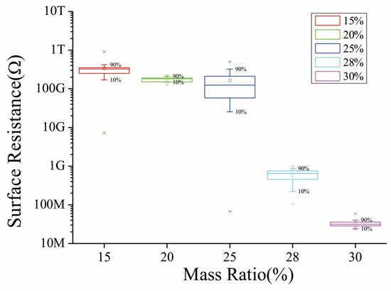 <sinγ>μ is an indication of the orientation degree of the fillers and complex to be calculated; however, there are two extreme cases of this volume: for randomly aligned fillers and for parallel aligned ones. <Vex> is the total excluded volume and same as <sinγ>μ: 1.4 for randomly and 2.8 for parallel [25]. Thus, the critical concentration can be as high as 29.53% when the MWNTs are totally paralleled. To search for this volume ratio of the composite SMF, we have prepared and exploited a series of different solutions for the fabricating process described in Section 3.2 (CDoE is 0.5 mm and the width of fiber film is 25 mm). The surface resistance is measured by a high resistance meter (ZC-90G, Shanghai Taiou Electronic, Shanghai, China) and shown in Figure 4, and the abscissa is the mass ratio for convenience. It is obvious that the critical concentration is located between 25% and 30% mass ratio, i.e., 15.5% and 18.6% volume ratio. Considering the resistance of SE decreases when force is applied, the mass ratio of the composite is chosen at 25% in order to reach reliable resistance measurement.