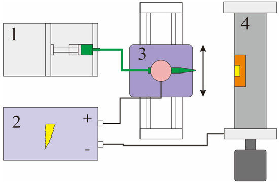 The diagram of fabrication system of aligned SMFs on FPCB based on electrospinning device. Number 1 is a syringe pump, 2 is a high voltage generator, 3 is a linear motion stage and 4 is a motor-driven aluminum drum with FPCB attached.