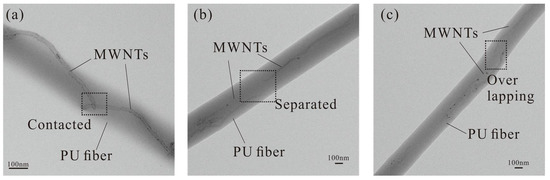 Transmission electron microscope (TEM) images to show positional relations between MWNTs in PU SMF: (a) Contacted MWNTs; (b) Separated MWNTs; (c) Overlapping MWNTs.