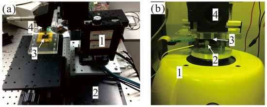 (a) A photo of static test equipment, where 1 is an auto positioner, 2 is a linear motion stage, 3 is proposed sensor and 4 is a static force sensor; (b) A photo of dynamic test equipment, where 1 is a vibration exciter, 2 is a dynamic force sensor, 3 is proposed sensor and 4 is manual positioner.