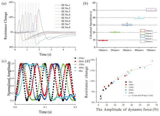 (a) Output of parallel SEs (CDoE is 1 mm) under a sliding of 10 mm/s filtered by 30 Hz low-pass; (b) Calculated speed from the time difference of output’s peak between adjacent SEs; (c) Normalized output of a SE under sine indentations with different frequencies filtered by 30 Hz low-pass; (d) The responses of the SE to sine indentations with different frequencies.