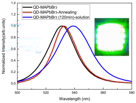 - Huang, H.L.; Zhao, F.C.; Liu, L.G.; Zhang, F.; Wu, X.G.; Shi, L.J.; Zou, B.S.; Pei, Q.B.; Zhong, H.Z. Emulsion Synthesis of Size-Tunable CH3NH3PbBr3 Quantum Dots: An Alternative Route toward Efficient Light-Emitting Diodes. ACS Appl. Mater. Interfaces 2015, 7, 28128–28133. [Google Scholar] [CrossRef] [PubMed]