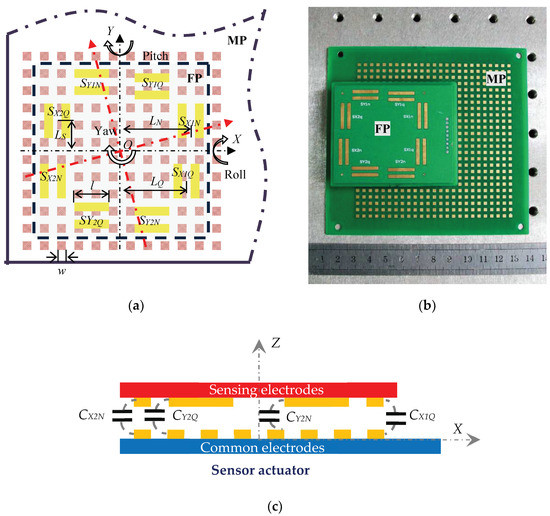 Two pairs of normal and quadrature sensing electrodes on the FP for both X and Y displacement demodulation, which consist of eight sensing capacitors with common electrodes, namely, SX1N, SX1Q, SX2N, SX2Q, SY2N, SY2Q, SY1N, and SY1Q. Given that the common electrodes on MP are parallel patterned, capacitance variations of eight sensing capacitors are all in perfect periodic triangular waveforms when setting aside fringe effects. Noticed that four sensing capacitors (SX1Q, SX2Q, SY1Q, SY2Q) are all (1/2)w shifted to sensing capacitors (SX1N, SX2N, SY1N, SY2N) in their respective measurement directions, generating four sets of orthogonal signals. Demodulating displacement information from which would diminish the influences of roll, yaw, and pitch angular errors to the most extent.