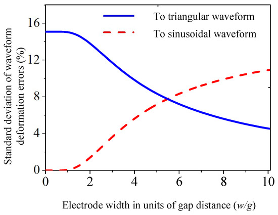 Electrode width to gap-distance ratio (w/g) is implied to be one of the key factors that determines sensor waveform. Results from Figure 2 illustrates the standard deviation comparison of waveform deformation errors, which indicates that the proposed sensor signals are neither ideal triangular nor sinusoidal waveforms. When electrode width is less than two-times the gap distance, the actual waveform is of close dependence on sinusoidal waveform, however this implementation sacrifices measuring sensitivity.