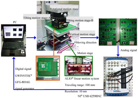 Test bench of the proposed encoder-like capacitive positioning system is designed and implemented as Figure 4, which is constituted of the PCB-based capacitive sensor, a micro motion stage, analog signal sampling circuit, and an EMD interpolation system. The test bench is implemented in a faraday cage to prevent the system from the surrounding electrostatic charges.