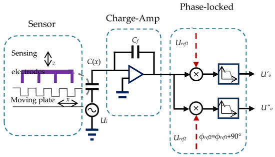 The MP and FP are fabricated based on a printed circuit board structure, the copper clad thickness of the MP and FP is 35 µm. The micro motion stage is consists of a NANOMOTION® motor (The Johnson Electric Company, Isreal), a rotating stage, a vertical stage, and two tilting stages. The NANOMOTION® motor with 10 nm resolution provides the displacement in X direction, the measuring speed is set as 1 mm/s. The tilting, vertical, and rotating stages are mounted for error adjustment and system calibration. The EMD interpolation system is constructed on LABVIEW® (National Instruments Corporation, Austin, TX, USA), the sampling frequency of is set to 400 Hz. Phase-locked detection is applied for a signal sampling circuit as shown in Figure 5. A driving voltage with amplitude of 1 V and frequency of 1 MHz is applied at the sensing capacitors, and each resulting current is converted to a voltage by the charge amplifier (AD633, Analog Devices, Norwood, MA, USA). Two reference signals (e.g., Uref1 and Uref2) are mixed with each acquired signal, generating two output voltages as Uo′ and Uo″. Uref2 shares the same frequency with Uref1, but whose phase position is 90° shifted to the later one. This difference is also delivered to output voltages Uo′ and Uo″. As a result, with the use of the following equation, it is possible to eliminate parasitic capacitance changes due to changes in relative humidity, temperature, and pressure [21,22].