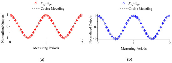 Figure 6a depicts demodulated actual sensor signal in X direction when the electrode length is four times the gap distance. Specifically, gap distance is set to 0.5 mm compared to electrode length as 2 mm. The results indicates that the normalized outputs are in close dependence to cosine waveforms. However, as it shown in Figure 7a, the standard deviation of waveform errors to ideal cosine waveform are as high as 4.43%, thereby introducing severe nonlinearity errors to output waveforms.