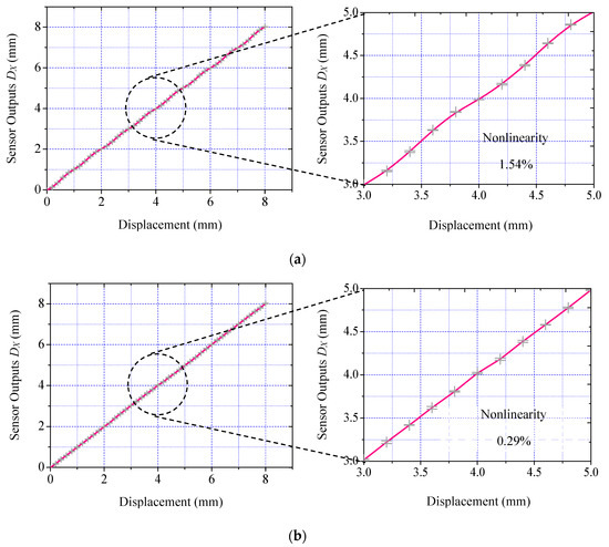 Figure 8a plots the acquired nominal displacement in X direction interpreted from the original signals. Acquired waveforms exhibit severe distortion. Signal nonlinearity is as high as 1.54%. The proposed EMD approach removes the influences of fringe effects. Figure 8b shows the acquired nominal displacement in the X direction by loading the EMD approach. Signal nonlinearity stays consistent as only 0.29%. This result validates effectiveness of the proposed method.
